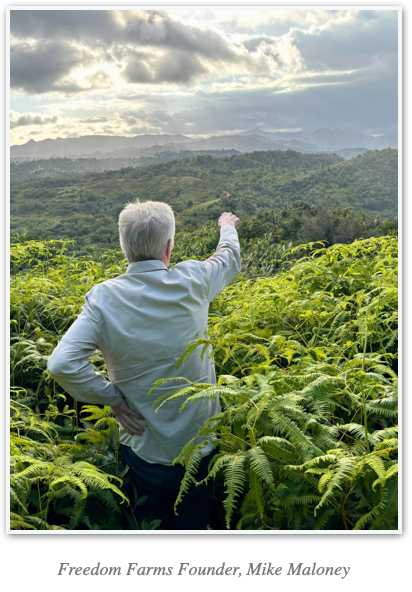 Puerto Rico imports 85% of its food, and because of a law called the Jones Act, the cost can be up to 40% higher than in the US. As one of this tropical island’s highest-elevation farms, we enjoy air temperatures some 8°F – 18°F cooler than most others, allowing us to grow locally what is usually imported at outrageous cost. We also qualify for extraordinary tax exemptions. No sales tax, import duties, excise tax, use tax, and 90% of our income is tax exempt. Due to this unique set of circumstances Freedom Farms is probably the only place on earth where experiments to reduce the cost of carbon-negative permaculture farming to below that of modern chemical farming, can be conducted profitably and therefore sustainably. Once achieved, farmers everywhere will adopt these techniques simply because they are more profitable, and we will have changed the world for the better. Farming is the only activity mankind does massively, on a global scale, that can reverse the coming environmental catastrophe— naturally.